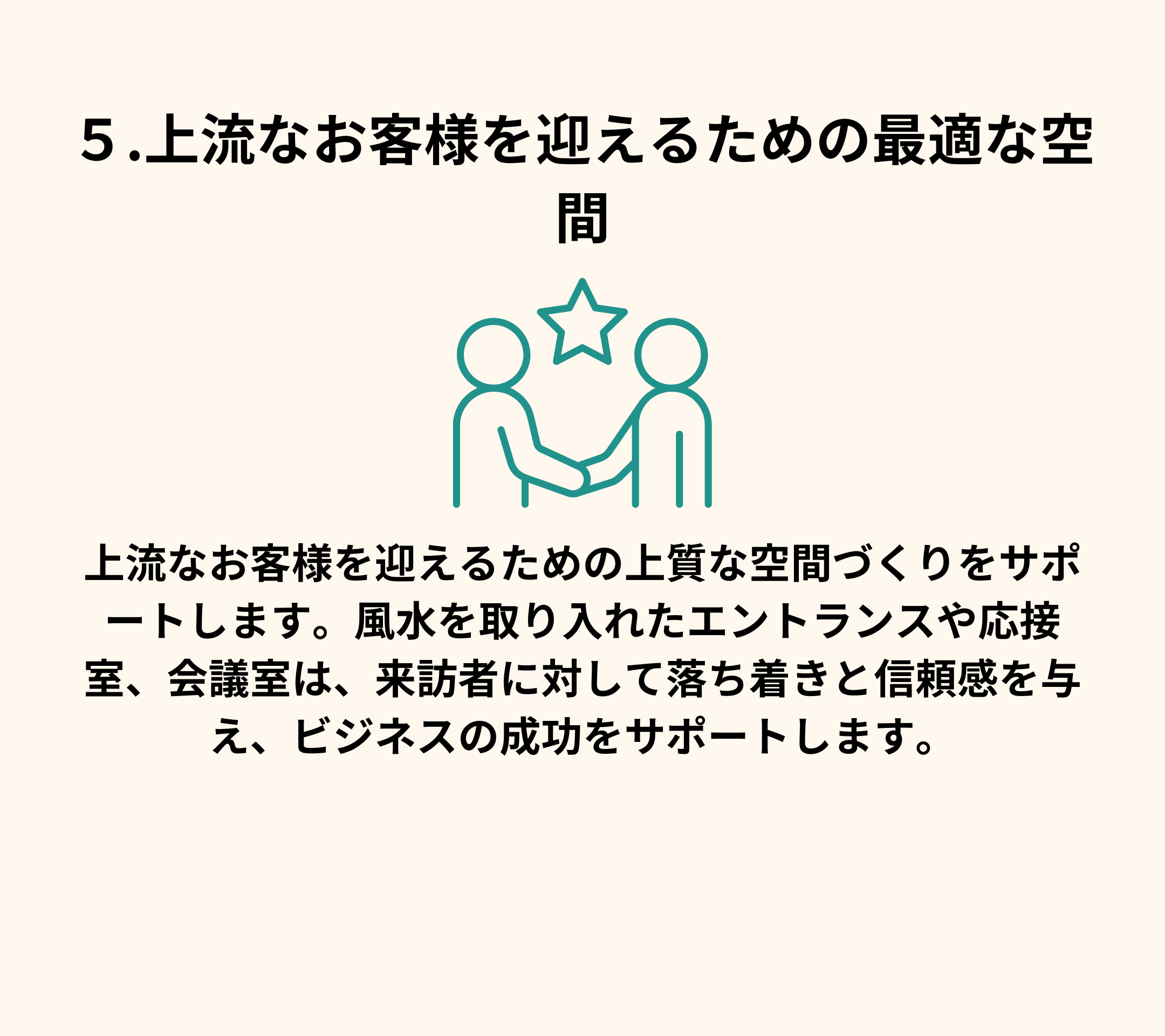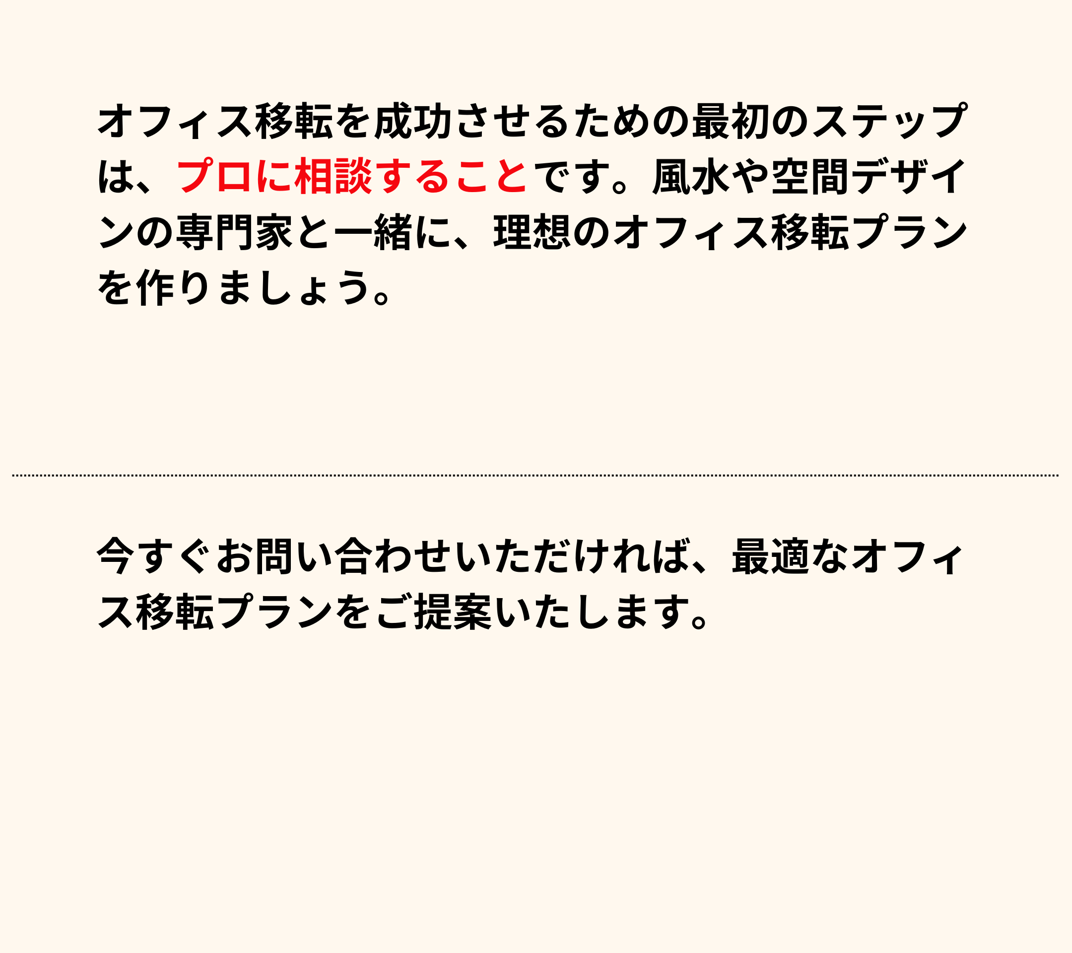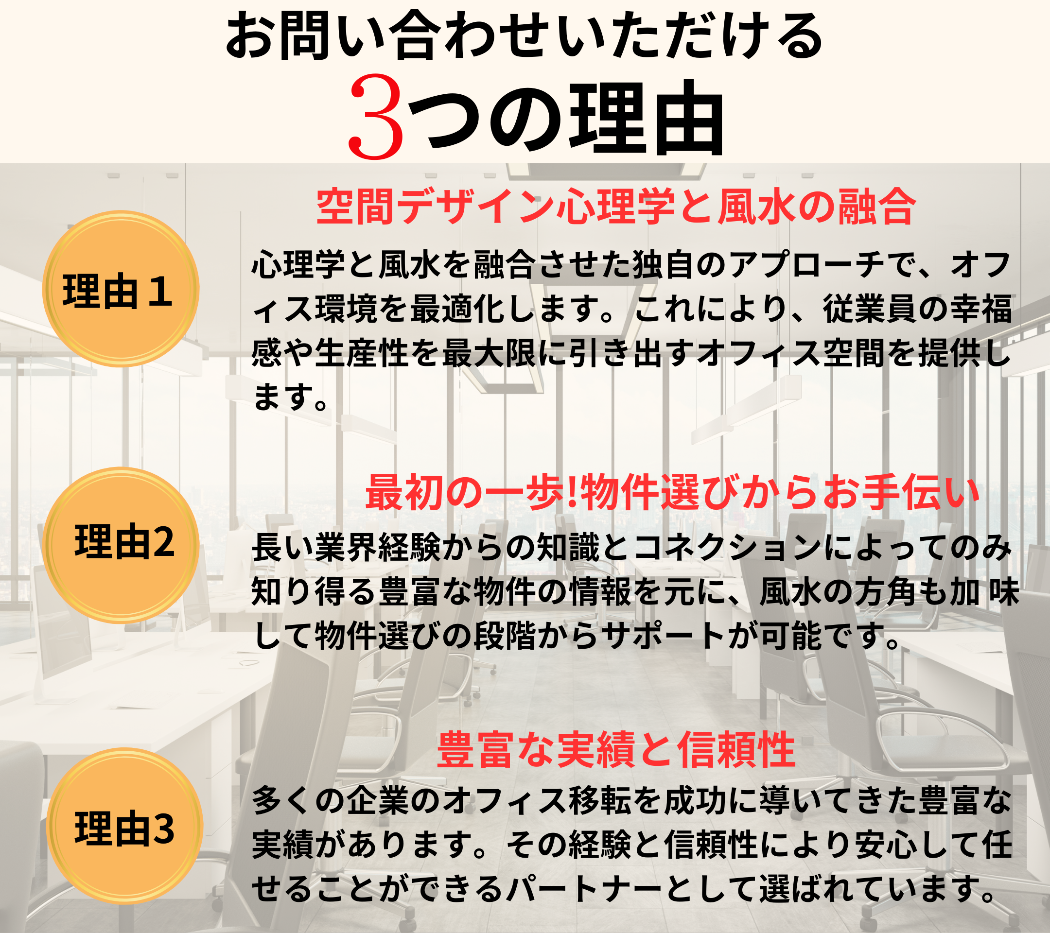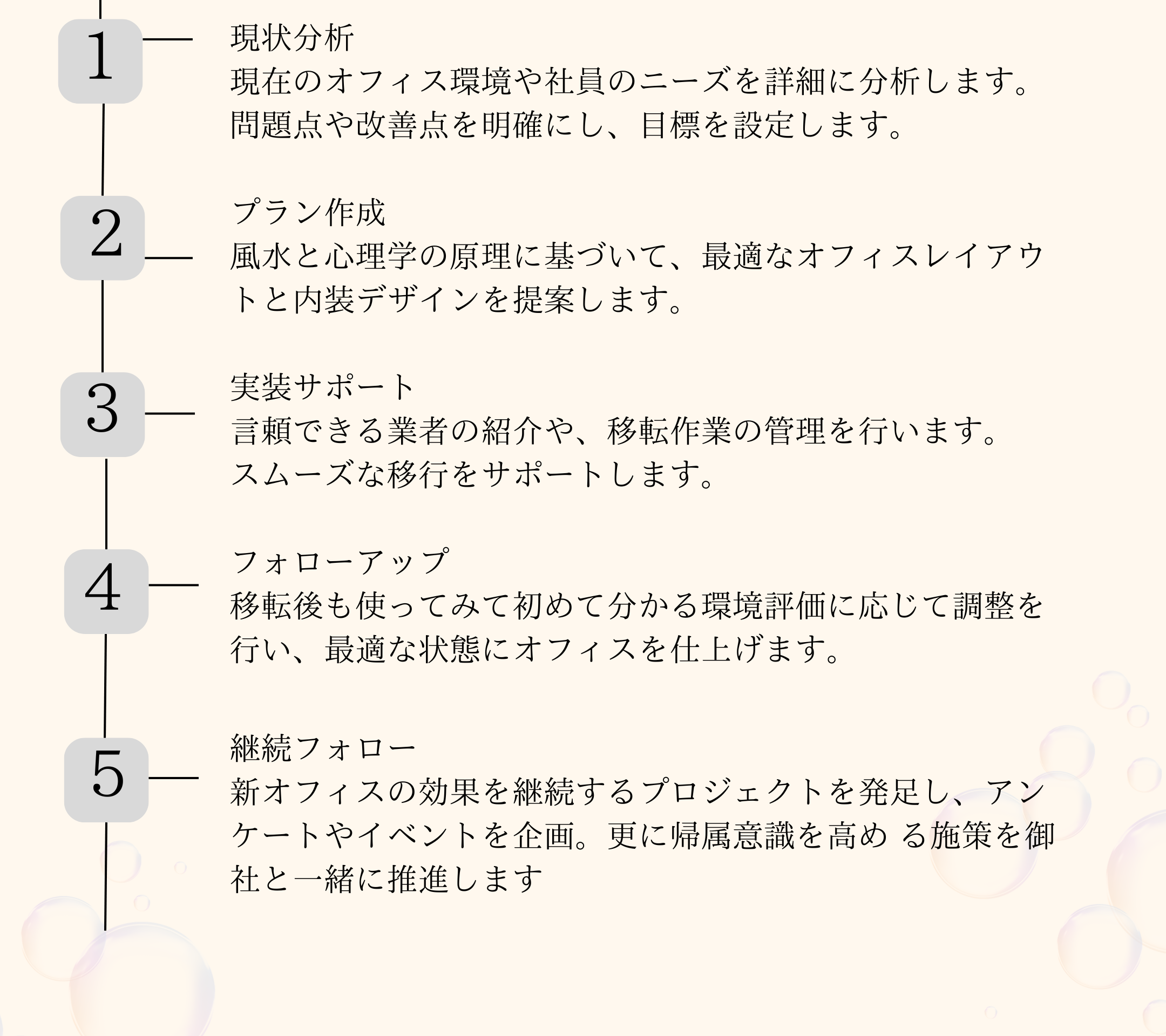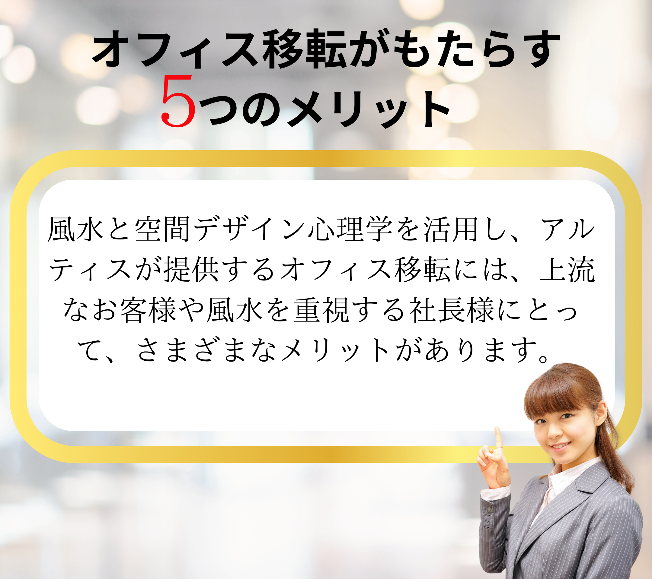 アルティスでは、風水の専門家が調査を行い、オフィスのレイアウトや配置、インテリアデザインを風水の原則に基づいて提案します。物件選びの段階から風水を考慮し、運気を高める最適なオフィス移転をサポートいたします。
