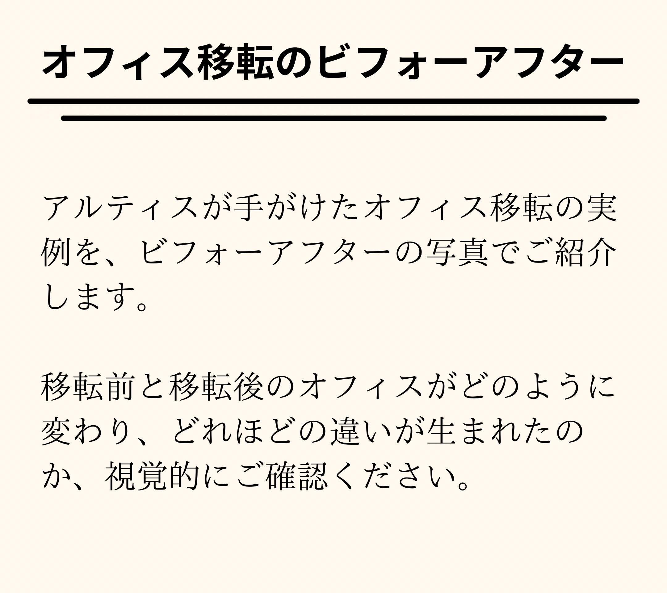 コストは移転先の立地や規模、必要なリノベーションの内容によって異なります。アルティスでは、お客様の予算に応じた最適な移転プランを提案し、コストパフォーマンスの高いオフィス移転を実現します。お見積もりは無料でご提供いたしますので、お気軽にご相談ください。