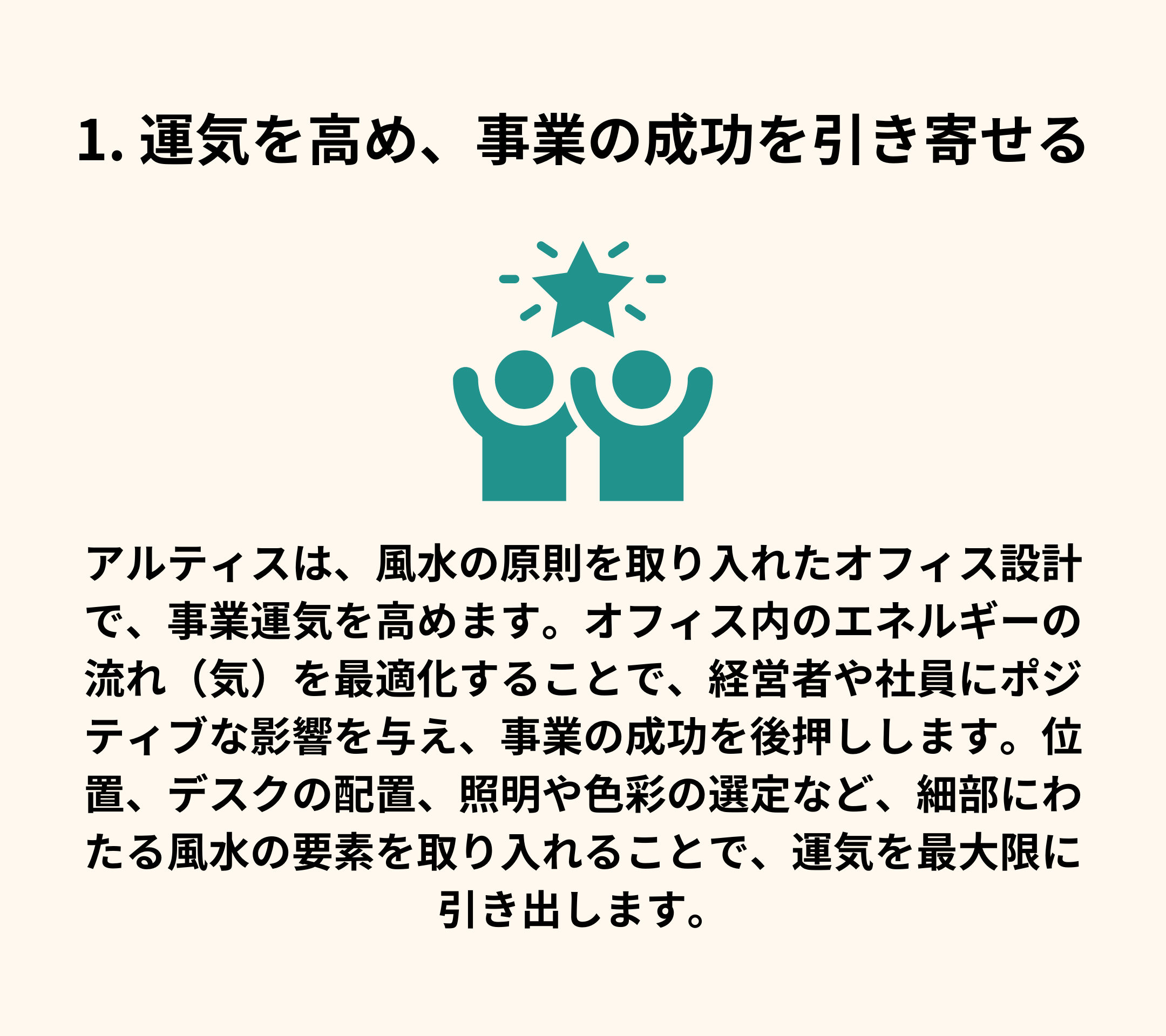 アルティスでは、風水の専門家が調査を行い、オフィスのレイアウトや配置、インテリアデザインを風水の原則に基づいて提案します。物件選びの段階から風水を考慮し、運気を高める最適なオフィス移転をサポートいたします。