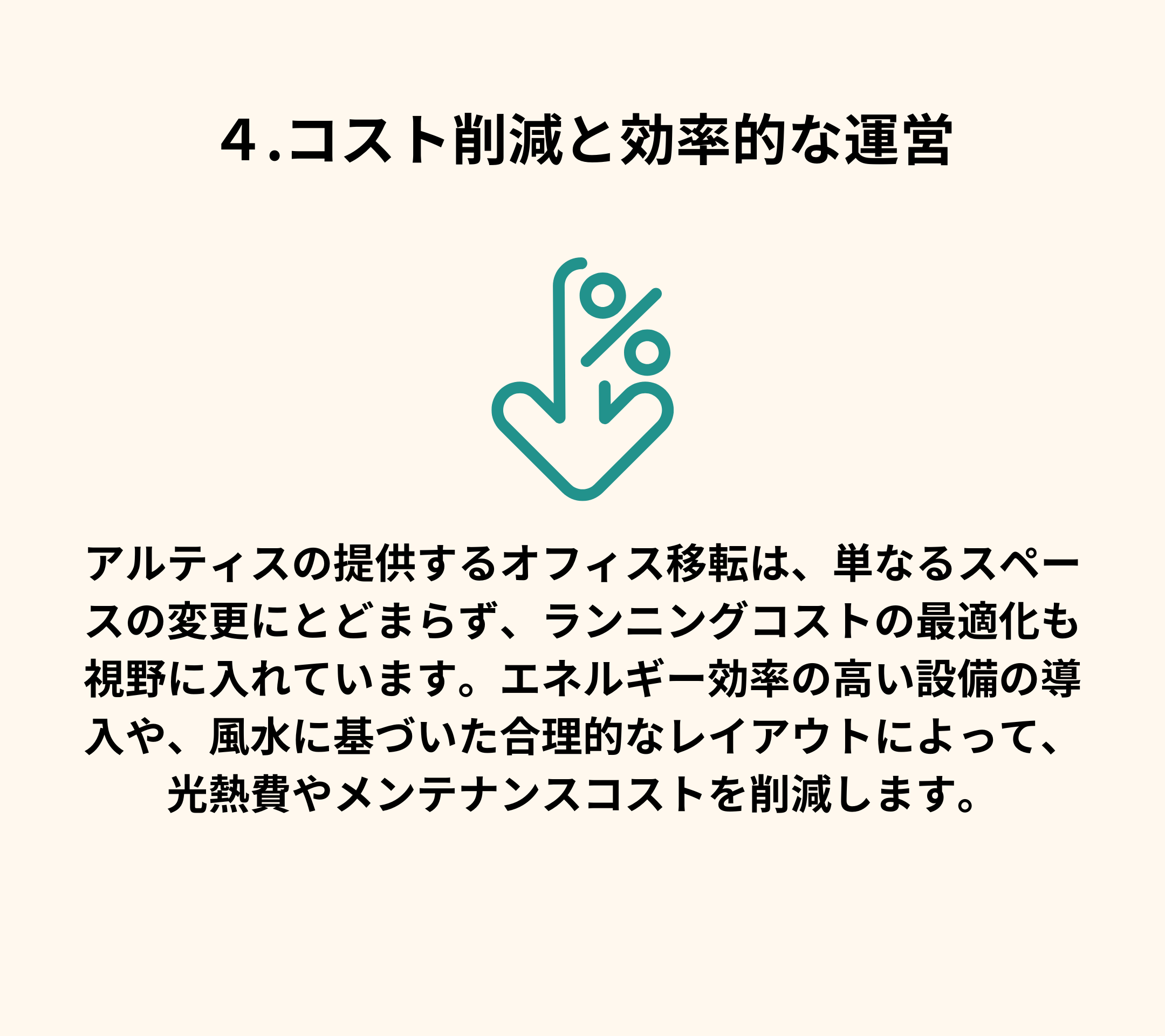 コストは移転先の立地や規模、必要なリノベーションの内容によって異なります。アルティスでは、お客様の予算に応じた最適な移転プランを提案し、コストパフォーマンスの高いオフィス移転を実現します。お見積もりは無料でご提供いたしますので、お気軽にご相談ください。