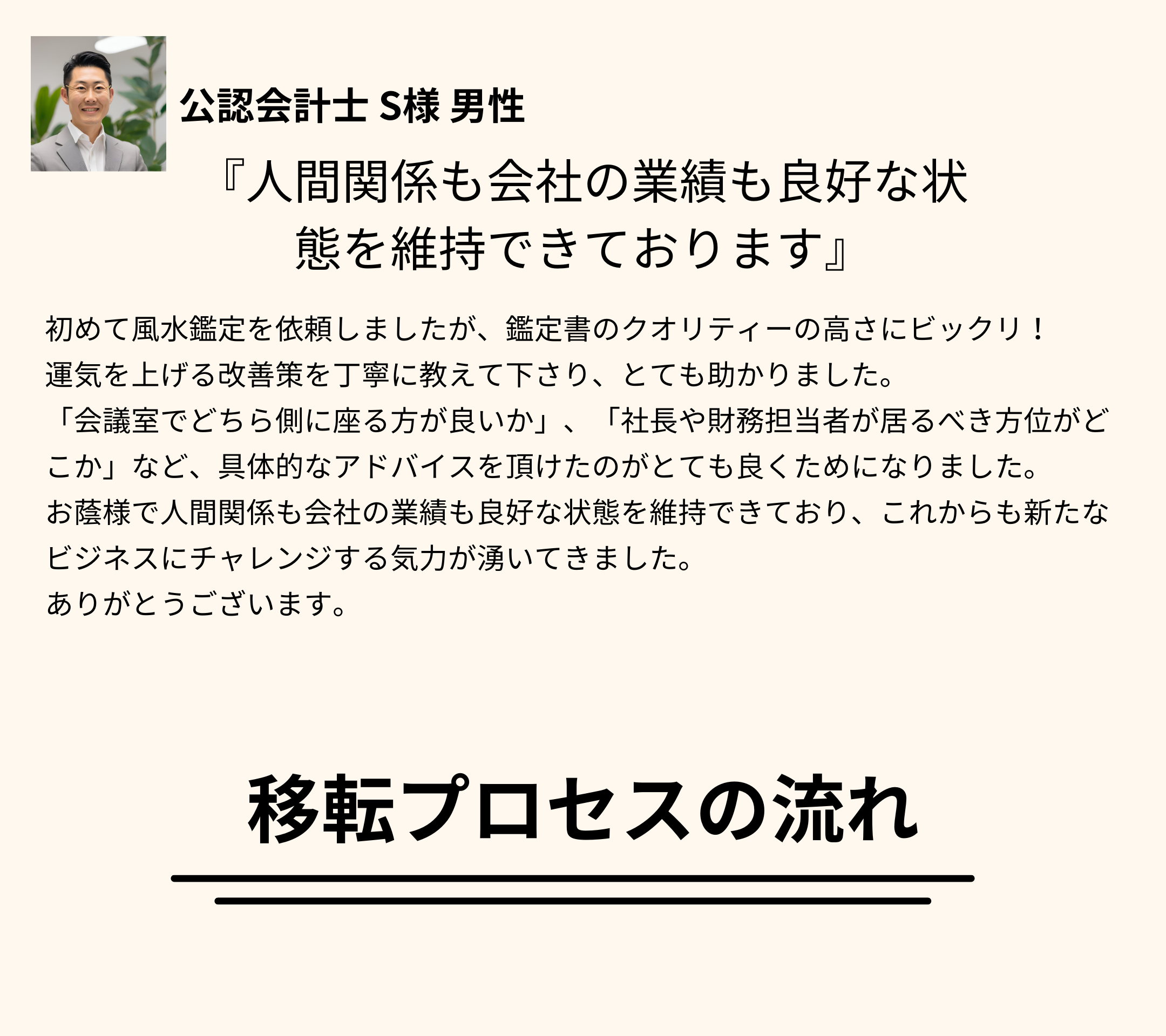 長い業界経験からの知識とコネクションによってのみ知り得る豊富な物件の情報を元に、風水の方位も加味した物件を見つけてくることが出来ます。煩わしい物件を探す手間は掛かりません。風水の効果も説明しますので、選ばれた物件の中から最適なものを選択するだけになります。